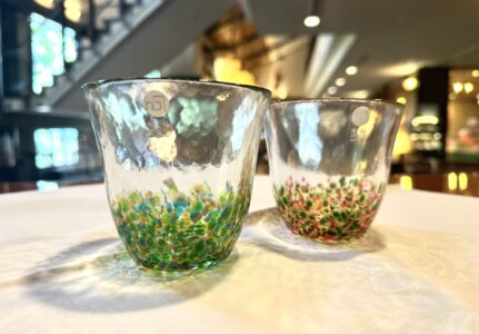 アソベの森いわき荘と津軽びいどろのコラボグラスが誕生しました! いわき荘のイメージカラーの緑を基調としたグラスと、いわき荘のシンボルマークである加藤武夫さんの【岩木秋夕】をイメージしたグ ...